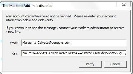 I have a recurring issue where some employees' Marketo plugin stops working with Outlook. This image was sent to me by the most recent indidivudal who is having issues.