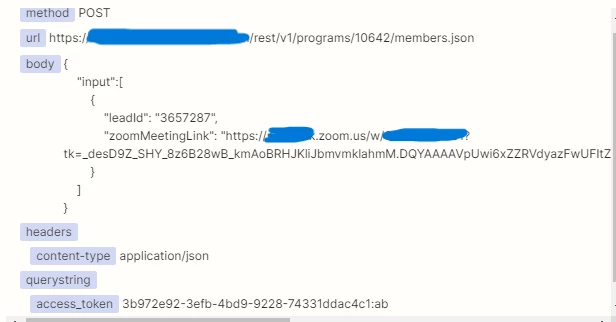 Later on the POST URL I'd put this: XXXXX.mktorest.com/rest/v1/programs/{program-id}/members.json?access_token={accessToken}