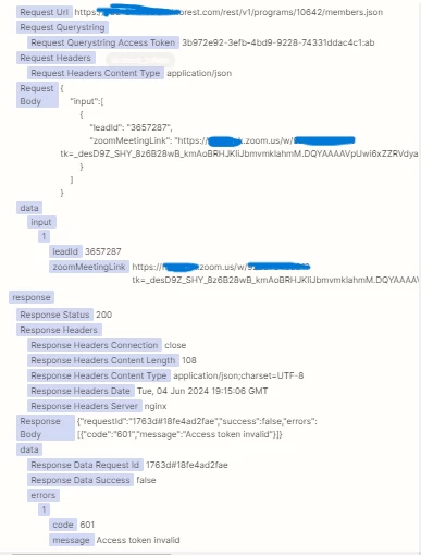 I have Marketo integrated with Zapier with an API Only user. Thing is I want to populate a PMCF from Zapier to Marketo for some webinar runs. While testing it out I've found that it actually worked but now that I'm live with real people, it won't populate that field as I keep receiving 601 codes from the Marketo API.
