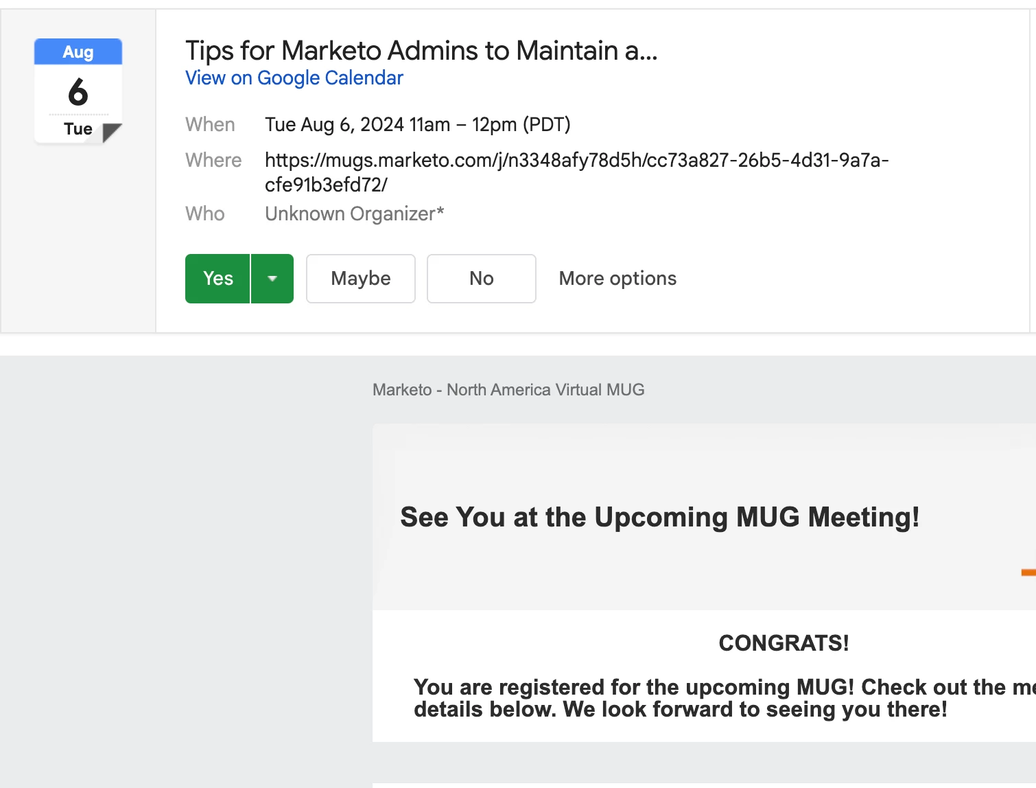 I've noticed confirmation emails that include Google Calendar information at the top with "Yes" prechecked, so the recipient doesn't have to click on anything to add the meeting to their Google Calendar. Has anyone tried implementing this in Marketo emails? I’m attaching a screenshot of a recent confirmation email I received after registering for Adobe's upcoming MUG for reference.