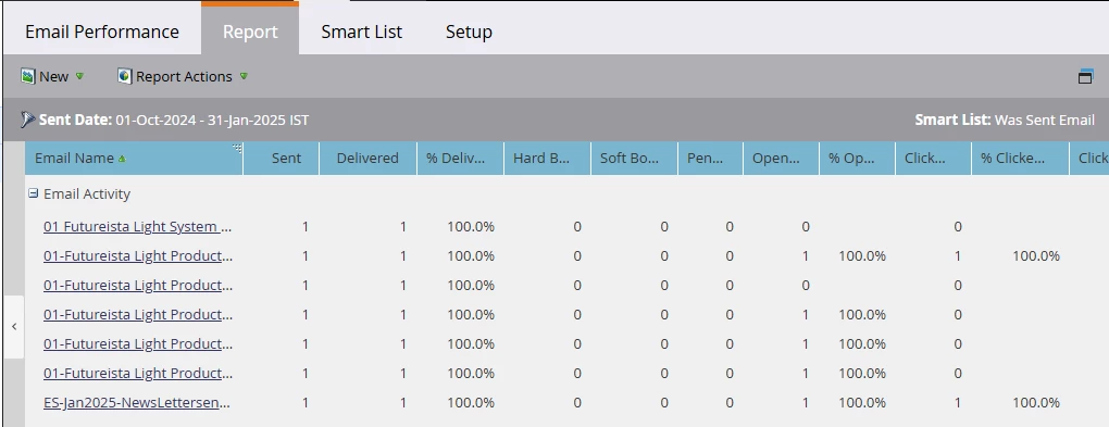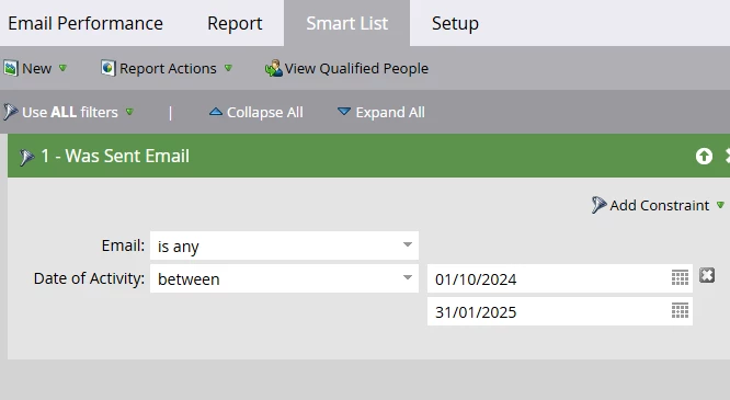 I'm trying to load the Email Performance Report in Marketo, but it's not loading. I had applied a smart list to filter for a specific set of people and emails sent between October 2024 and January 2025.