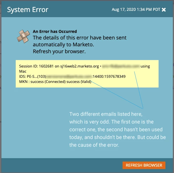 My colleagues and I have been experiencing issues with Marketo lately. When logged into an instance and performing changes, like updating an email template and previewing for example, Marketo comes with an error where you need to refresh the page, doing so you get kicked out of the instance and need to log in again. It seems to be happening right after the auto-save functionality when editing an email template for example. This happened without logging into any other instance today.