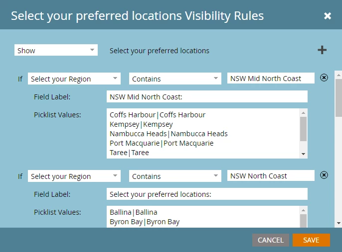 Created a Region custom field and added it to the form as Checkboxes. Created a Sites custom field and added it to the form as Checkboxes. Set up visibility rules so that when a selected Region contains the region name a list of sites associated with that region is shown. This works fine if I select just one Region, but a customer may choose multiple Regions, when they do this only Sites for the first region show and not all Sites for all selected regions. See my example setup in the image below: