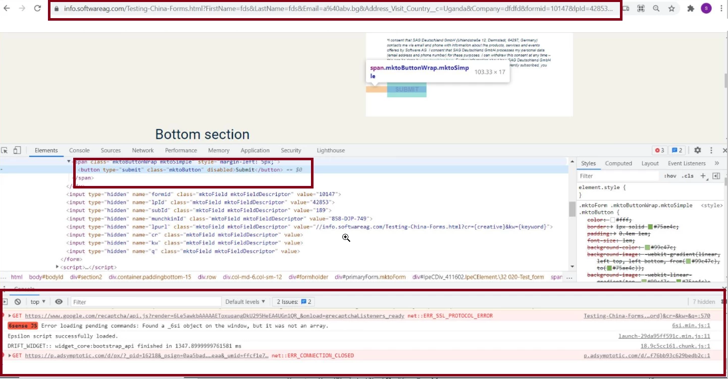 The form submits fine for me, but as seen on the below screenshot, the submit button gets "disabled" for China. This isn't coming from me or the template itself. I tried to cheat and removed the Disabled, then when I submitted the form, the field values(First Last name etc.) appeared in the URL and the submission was not successful.