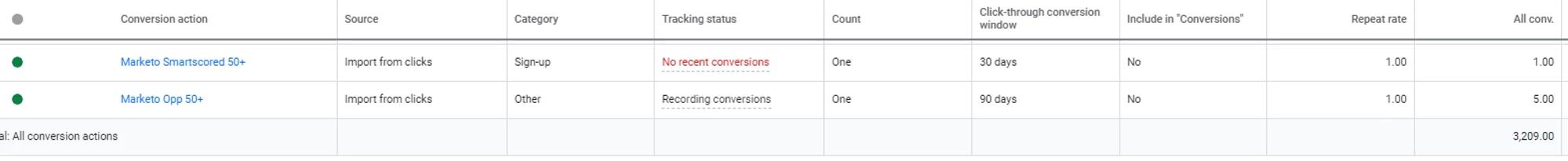 - Mapped the stages to new offline conversion metrics in Google Ads. The new conversion fields DID appear in Google Ads when I created them in Marketo, but no actual conversions are coming through.