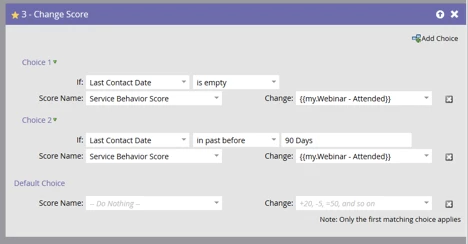 For the scoring piece, I like to combine the Servicing Score with a modified version of Engagement Score (webinar attendance, web visits, email clicks, etc.) to help the sales team identify a good time to reach out to that pool of customers. The reason I use a separate score value is that you will want to apply additional choice options on your change score flow steps for the servicing behavior based on the Last Contact Date which you wouldn’t want to do with your overall behavior score. You can build these right into the flow steps of your existing behavior score rules, and even use the same token values. You just add a choice based on your last contact date cutoff.