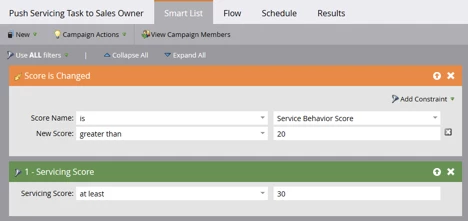 From here, you have trigger programs watching for Service Behavior Score changes to contacts with a Service Score for whichever groups you want to include and either assign a task or push an alert to their sales rep for follow up.