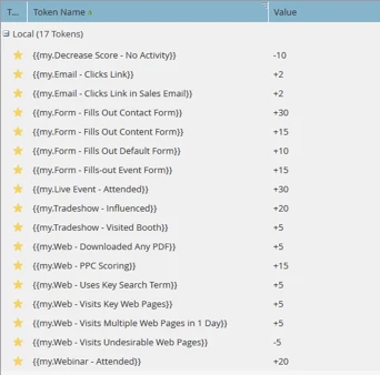 The biggest place where we leverage tokens is in the scoring values themselves. Simply to streamline the management of scoring change values for any given activity or engagement, creating all of those values as tokens puts all of your scoring values in a single place to manage and maintain which can save a ton of time in the long run, especially if you’re running multiple models or tweaking your scoring frequently.  I find it best to keep a single Scoring folder wherever you keep your Operational or Data Management campaigns and keep all of your scoring values in that parent folder.  This way, if you want to use the same score token across multiple scoring model programs, you can do so.