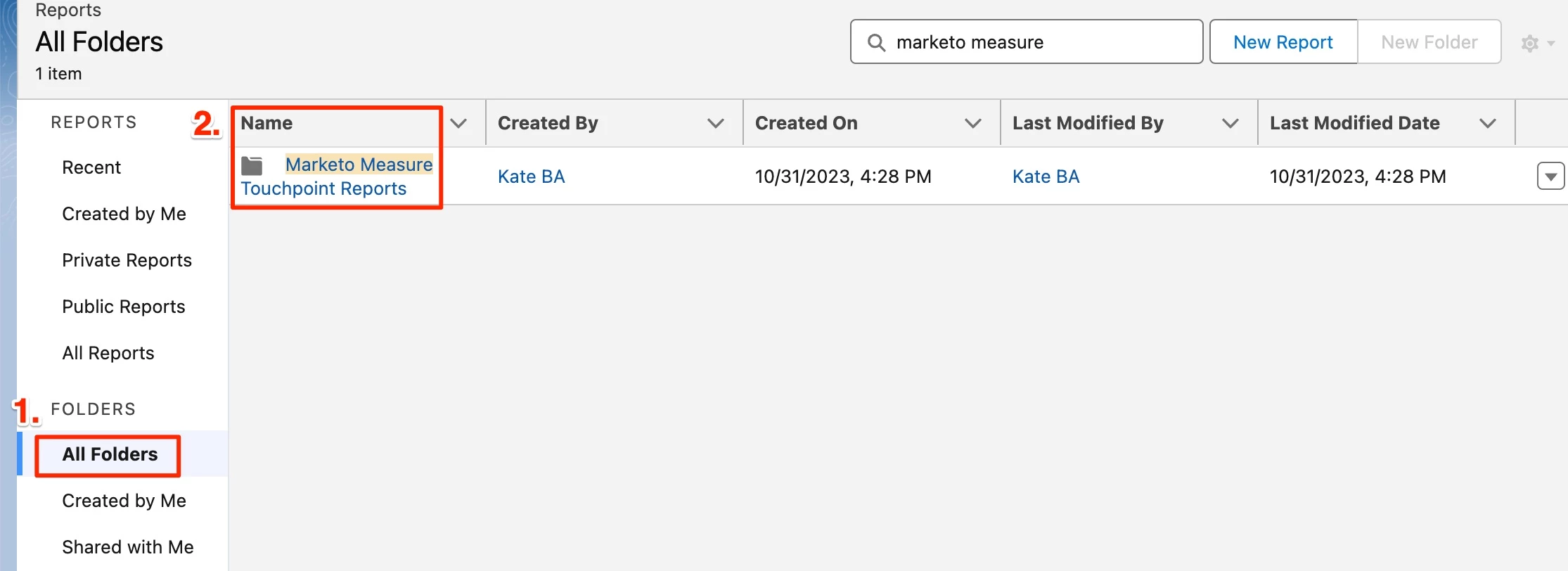 Note: these reports come with the SFDC managed package. They are housed in a folder called "Marketo Measure Touchpoint Reports". If you don't see this folder when you go to the All Folders section of Reports tab in SFDC, it means your SFDC Admin has not yet shared access. You'll need to ask them to do so.