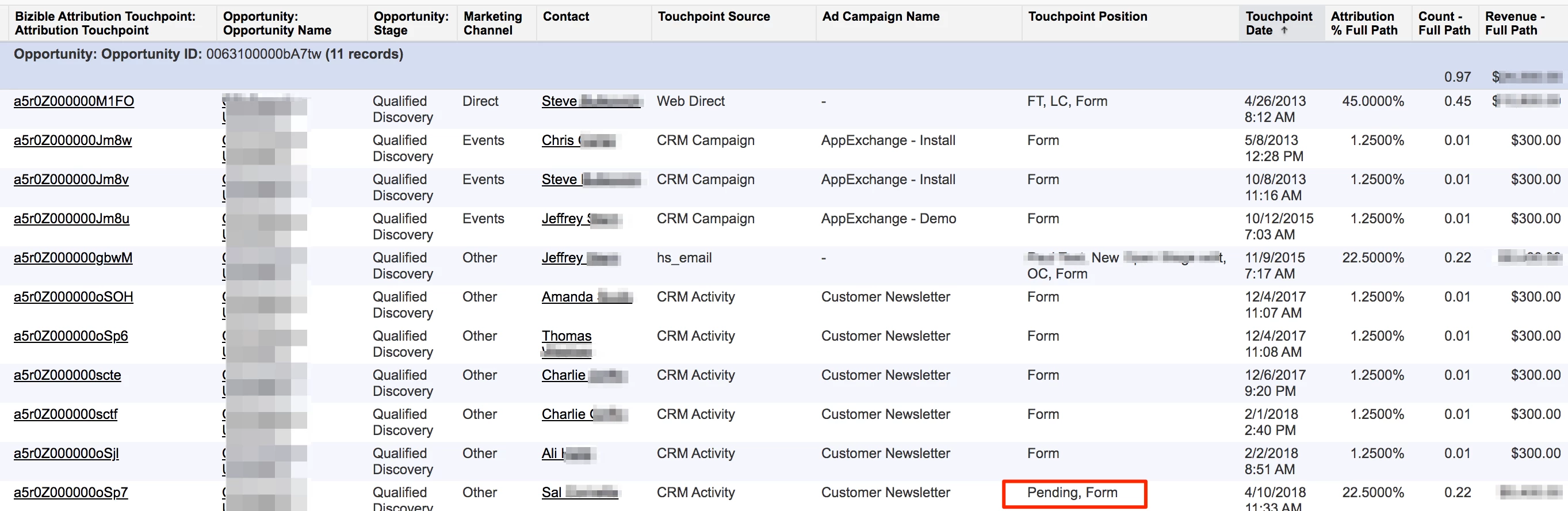 Here comes the curveball… when you’re looking at a Buyer Attribution Touchpoint report, you might also see a Touchpoint position of Pending. Here is what it would look like: