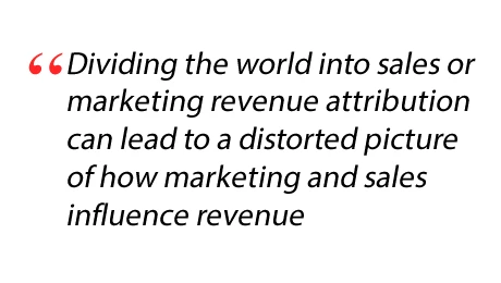 For this article, I am focusing on B2B companies. Single source attribution says, we can attribute the entire credit for an opportunity to one buyer – say, Sarah Smith, the Director of Purchasing. If lead source is the one and only attribution we apply, and we say Sarah is the person in the deal who counts the most, then we look at Sarah’s lead source – trade show, and apportion all of the credit for revenue to the trade show that acquired Sarah’s name in our database – great job marketing! Or alternatively, assume instead a sales person found Sarah on LinkedIn and added her name to the database. In that case, all of the credit for the deal would go to Sales for finding Sarah. There are lots of ways to declare single-source credit for a deal, from acquisition program to last response, to home-grown algorithms. The overarching goal for single source attribution is usually to determine whether sales or marketing sourced a deal, so management can allocate resources based on which function is sourcing the most pipeline or revenue. Dividing the world into sales or marketing revenue attribution has great appeal for obvious reasons, but it can lead to a distorted picture of how marketing and sales influence pipeline and revenue creation.