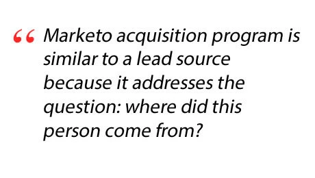 In the Marketo Revenue attribution model, Marketo calls this First Touch attribution – the program that gets credit for adding a person to the database. In hindsight they probably should have named it “Program Source” or something like that so people wouldn’t misinterpret it to mean the first program that engaged a person. Marketo acquisition program is similar to a lead source because it addresses the question: where did this person come from? But lead source and acquisition program are different – though there is often uniformity between the two, as in the case when a trade show program acquires a name, we can infer the lead source is trade show from the fact that the program that acquired the name is built on the Marketo trade show Channel. In Marketo, you need to have lead sources and acquisition program values assigned every time, and consistently – even when a name is added by a sales person from the CRM. That’s right, you should create a Marketo channel, call it Sales Generated, and create a Marketo program on the channel to collect new names and assign the First Touch credit for new names added by way of the CRM. That way, you can compare the ROI on acquiring names from the CRM with marketing tactics like Online Advertising or Tradeshows.