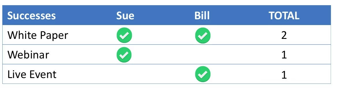 That makes four successes total across three programs. Sue and Bill were both in the White Paper program so that program gets 50% of the credit, the other two programs each take 25%.