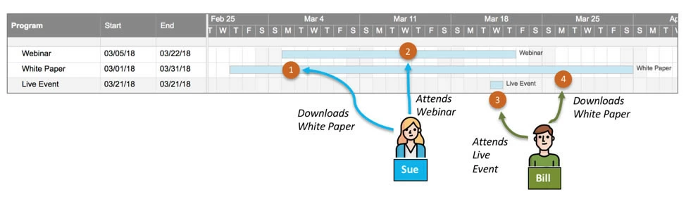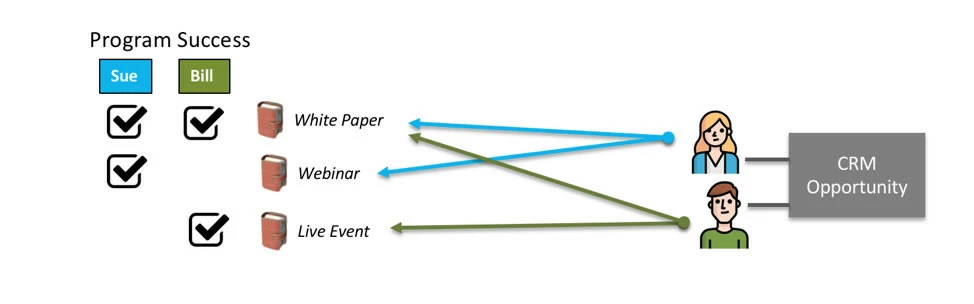 Sue the prospect attends a webinar and downloads a white paper. Bill the prospect downloads the same white paper and attends a live event. Suppose Sue and Bill get added to a $10K opportunity, Marketo will look at Sue and Bill’s marketing history and tally up their successes: