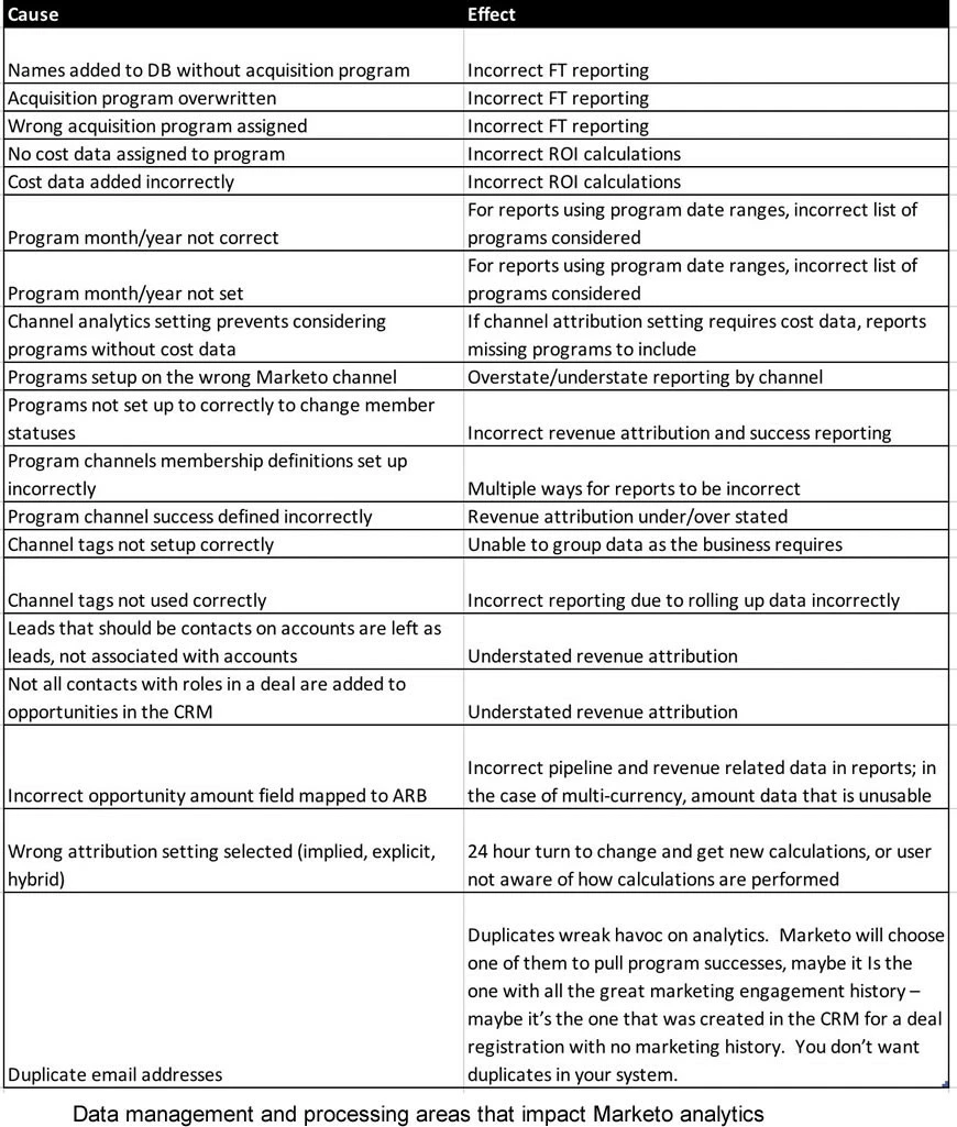 If you design your Marketo correctly and apply rigor to process and data every day, you will get revenue analytics that tell you a lot about your marketing that will help you be a smart marketer. If you don’t, you may expose yourself to revenue analytics that will tell an incomplete, or inaccurate story – and you may not even realize it. Even one bad list import can have a detrimental impact on your reports. Here is my attempt to list the data and process areas you need to consider: