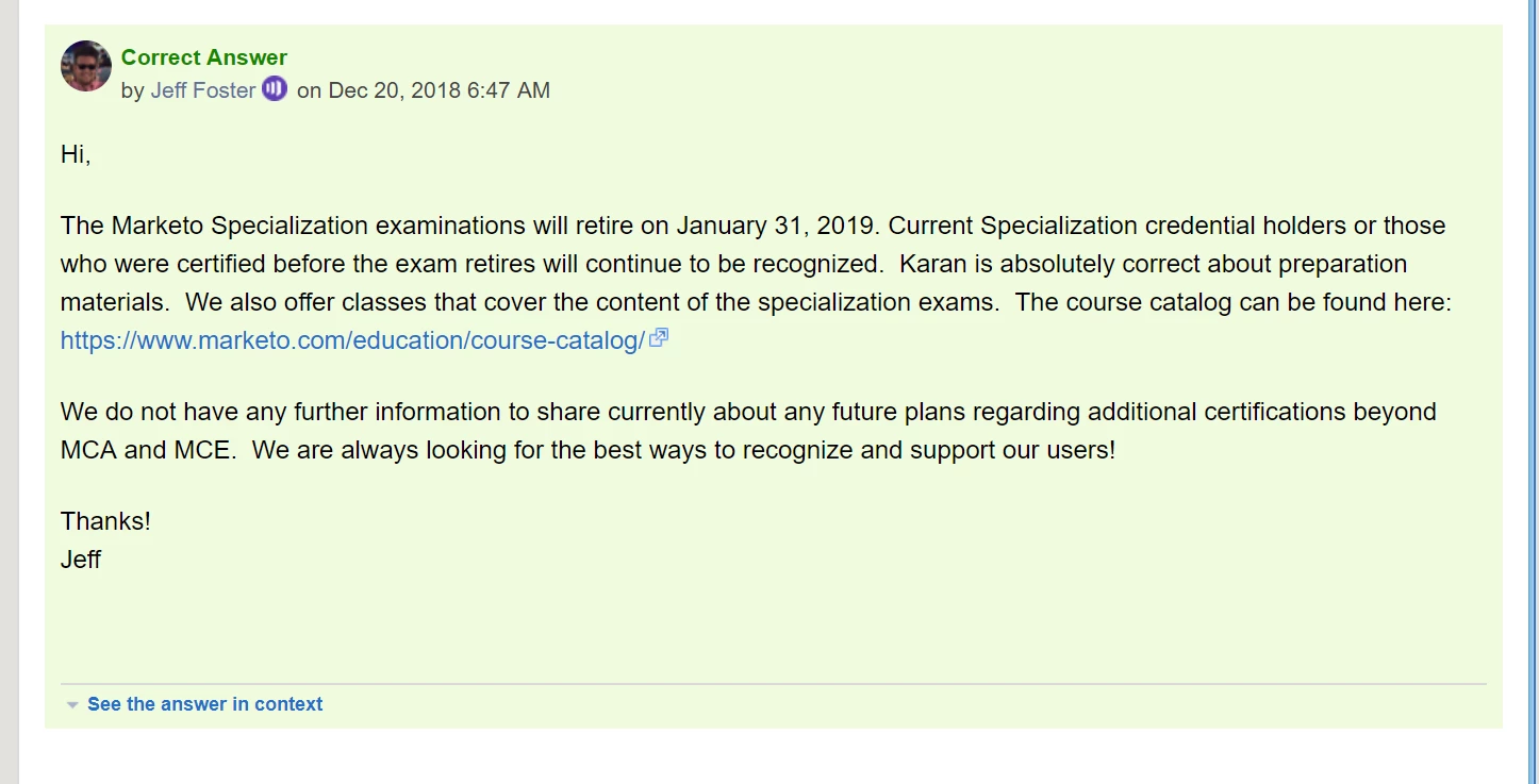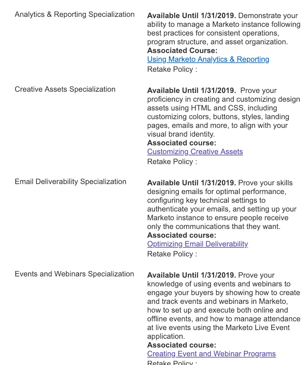 Does anyone know why the Marketo Specialization Exams are only available until 1/31/19? Are they being discontinued?