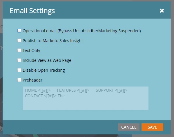 - Tokens will display in HTML and Text Only versions of emails, but will not populate in Preheaders created in the Email Settings pane