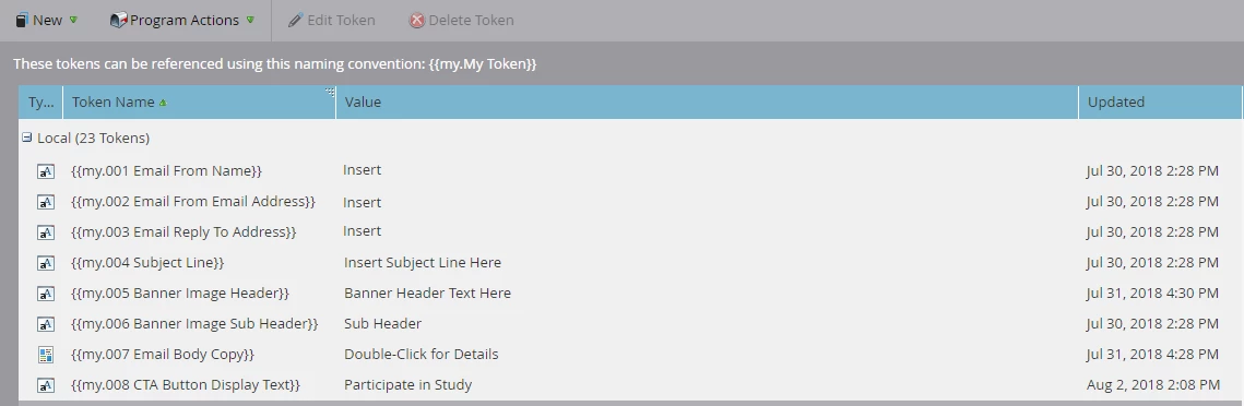 Local: Local tokens are built on the program level and are only accessible to assets within this program. These are incredibly useful when designing program templates that can be used for scaling programs very quickly. When you are on the Tokens tab of your program, select the type of token you are looking to create and identify the information you would like that token to populate when it is in use. When working in your assets, these tokens will be available as {{my.TokenName}}. Example: A Webinar Program which cm: Consists of three3 invitation emails, a registration landing page, registered confirmation email, and follow up emails. By having certain items in each of these assets set as local tokens such as Webinar Topic, Date, and Time, you can quickly change the information in the tokens tab for these items and the information will be updated across all of these assets. {{my.WebinarDate}}.