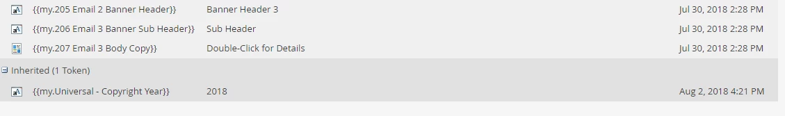 Example: Your company frequently changes the count of product offerings available to customers. By only having this information on the template, each time that number updates you have to change it on the template level for future sends, but also on every asset that may have used that token and then re-approve the asset for the update to take effect. With tokens, one change can impact all assets that use it without the need to go back and reapprove every asset. This helps improve quality and consistency while expediating scaling. When building these tokens, begin the Token name with Universal to denote which tokens are your Universal tokens to be used everywhere. These tokens will appear in the Tokens tab of your programs near the bottom, under a heading labeled Inherited.