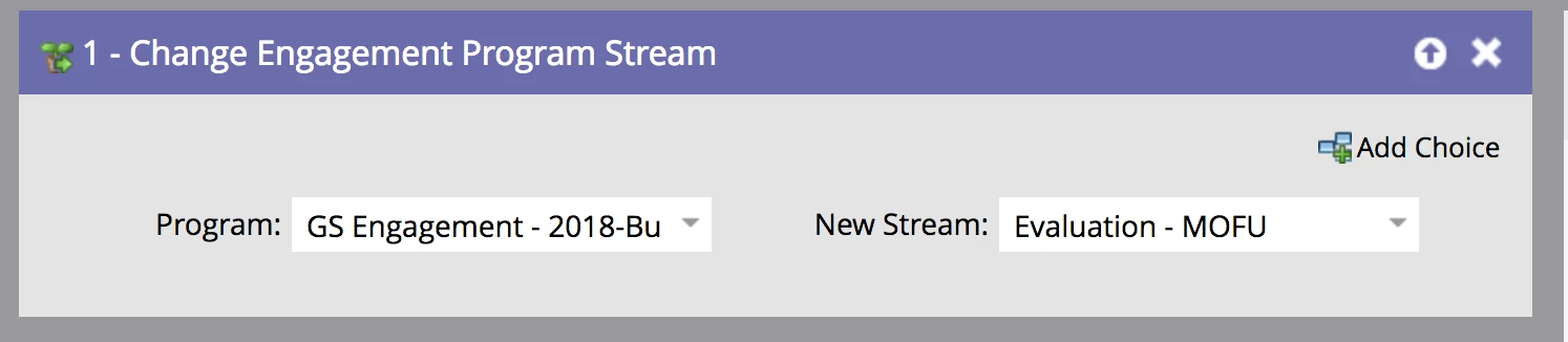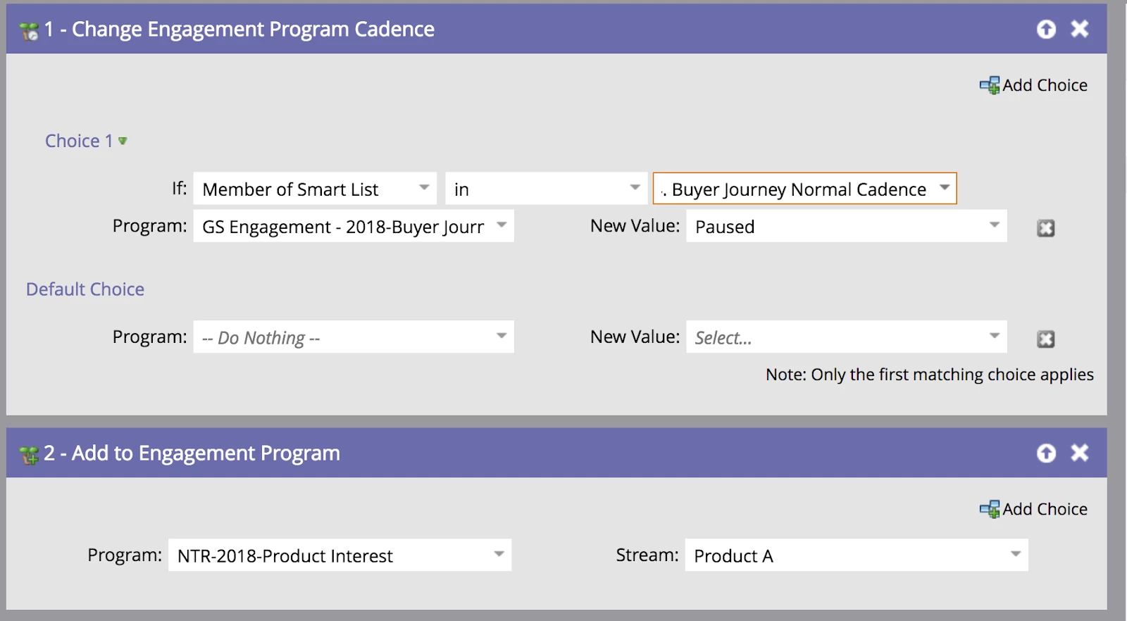 - Add to Engagement Program-->If Member of Smart List A, Engagement Program A, where Stream=Stream 1 and so on. Like in (i), you can also add choices to determine which stream if any of these programs have multiple streams.