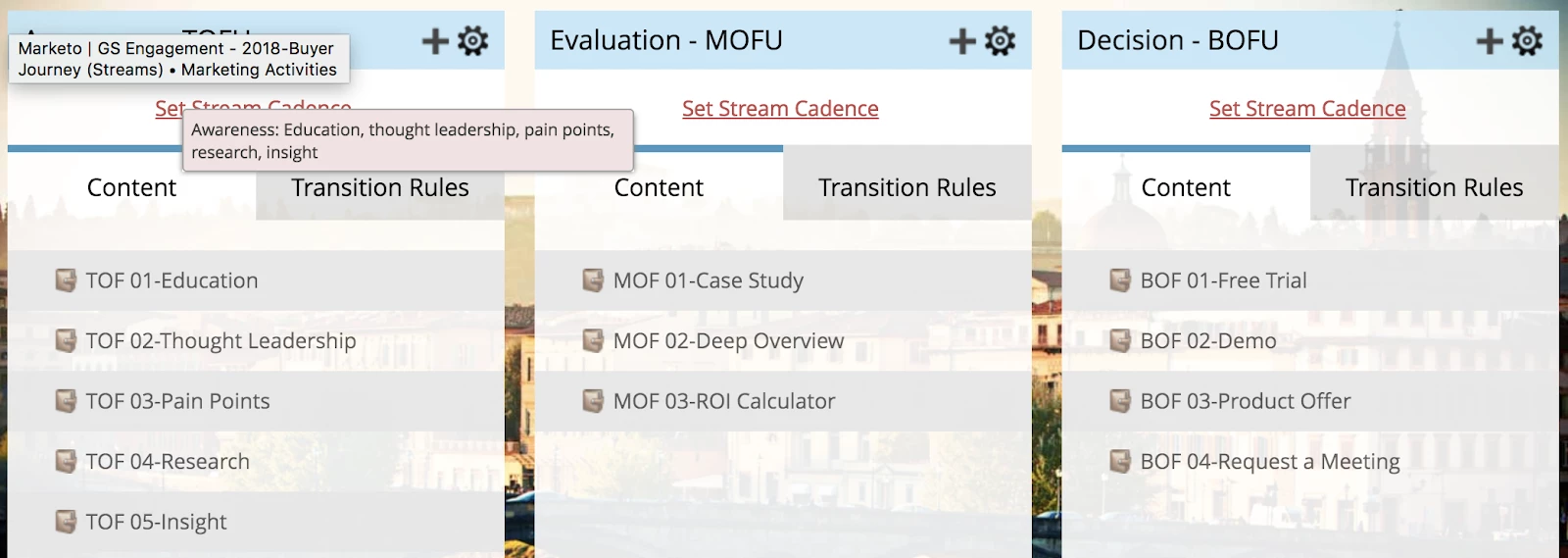 Certain Engagement Program strategies include nurturing leads further down the funnel. In these cases, you can set up streams of content with early / mid / late stage content to keep the person’s interest.