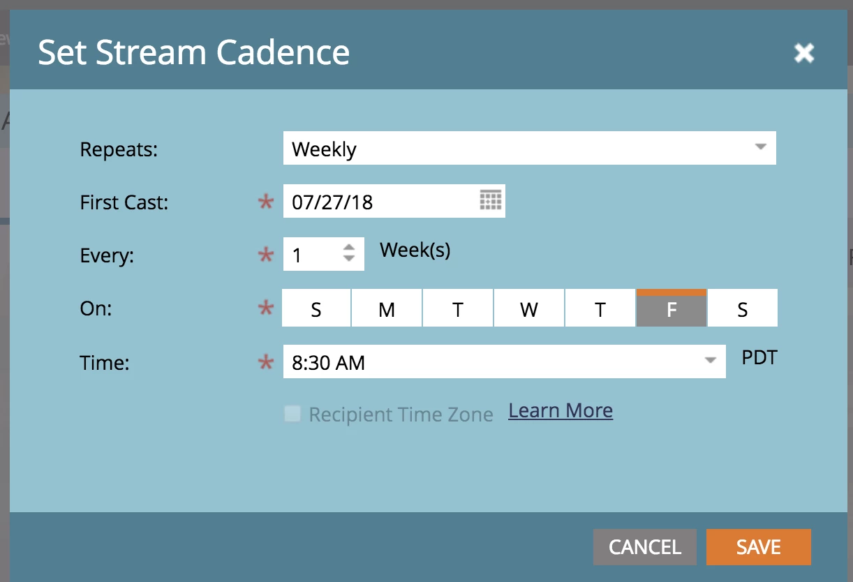 Once content in a stream is activated and ready to send, your cadence must be set to determine how often emails should be sent. When you send out content is known as the cast.