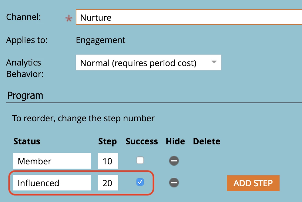 Let’s talk about success. If you invite someone to a trade show and they visit your booth, that’s a success! Similarly, we need to define goals for our Engagement Programs and define them at a global level. Often times, a click in one of the emails constitutes success in your stream. Whatever you define as success, create a channel status for it: