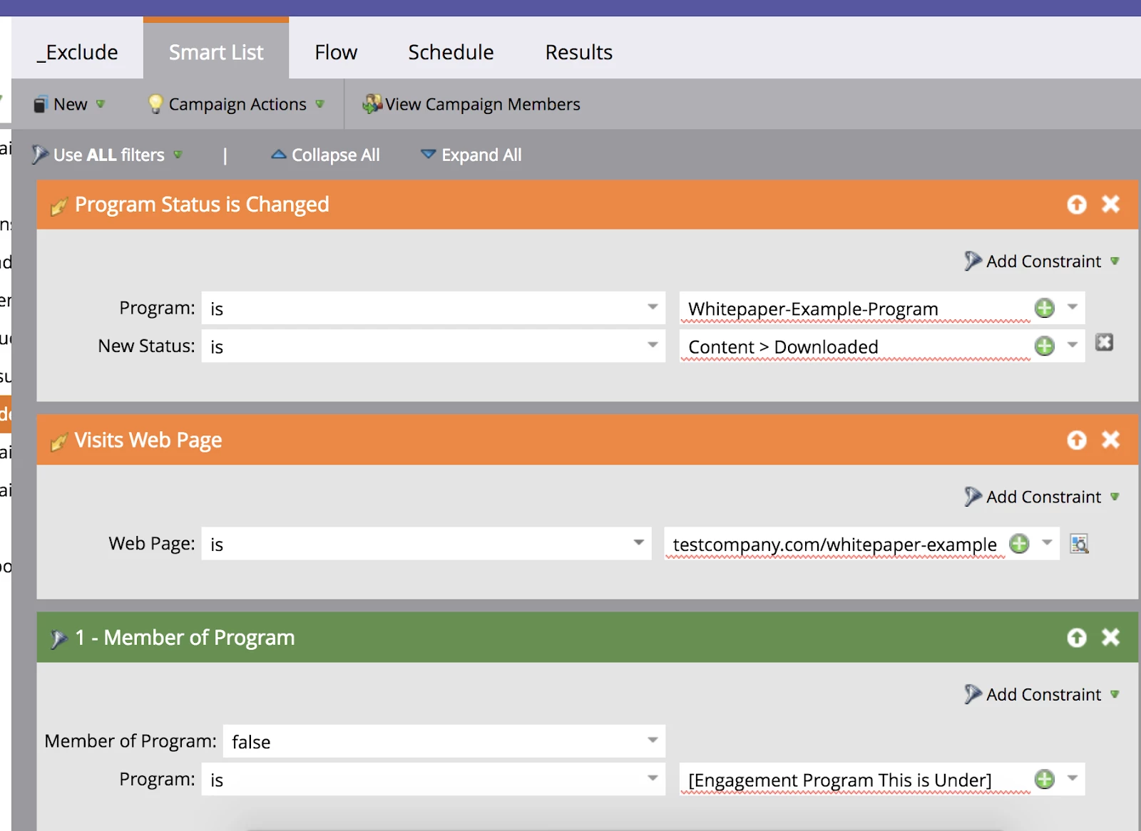 For example, if someone already downloaded a white paper, you may not what to send them the nurture email that points to that particular asset. To solve this, go to the nested nurture program for the white paper and create the following Smart Campaign: