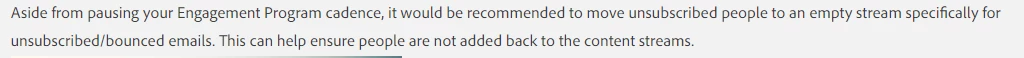 Aside from pausing your Engagement Program cadence, it would be recommended to move unsubscribed people to an empty stream specifically for unsubscribed/bounced emails. This can help ensure people are not added back to the content streams.