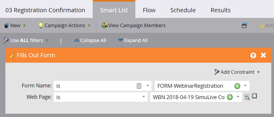 I set up a simple email alert that references the contact information of the customer so that I can follow up and fix the problem. My smart campaign has a trigger in the smart list of Program Status Changes to Registration Error. You can restrict this to one specific webinar using the constraints filter. I prefer to leave it open-ended so that I only have to set up one notification. However, it scales to every webinar so I can potentially leave it running forever.