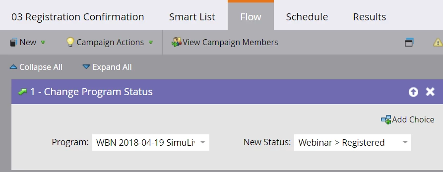 In the flow tab, add a step to change the status to Registered. Since your webinar event is connected to this program, when you change the status here, Marketo will send that information over to your webinar platform automatically. Voila! No upload needed.