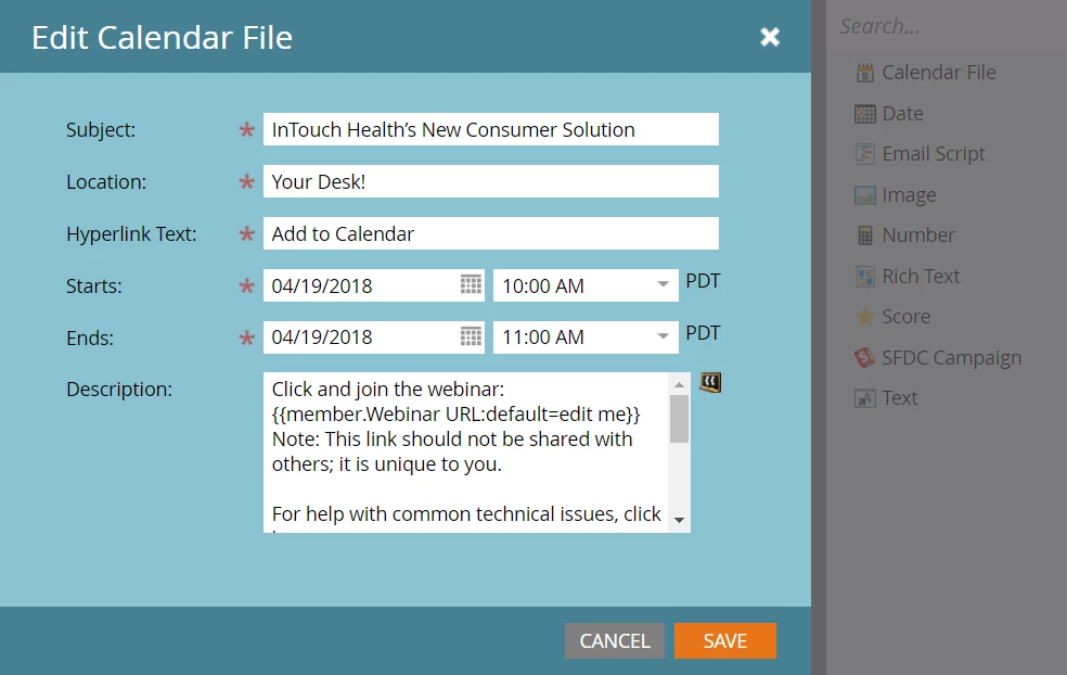 and find the {{member.Webinar URL:default=edit me}}. This is the custom URL generated by the webinar platform unique to each person. A great idea is to change edit me in the token to display “you have received an error, contact help@mydomain.com” so that if the token doesn’t render, the prospect will see your error message and can reach out to you! Normally you can’t put a token into a token (#Tokenception), but this is an exception to that rule. Another great idea includes adding links to knowledge base articles about common audio or technical issues. Save your calendar token.