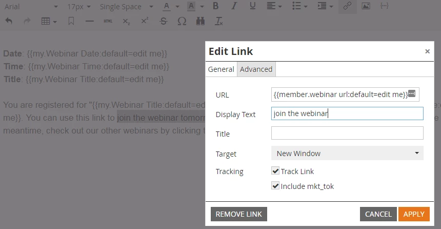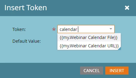 from the WYSIWYG editor and then searching for your particular webinar token. When it displays my.token name, that means the token is only for this particular program so you don’t have to worry about pulling in a calendar file from a webinar six months ago!