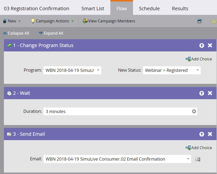 Remember earlier when we created a smart campaign to process registrations? Let’s use that to send the confirmation email—two birds, one smart campaign! Remember, we only want to use the same campaign if we haven’t started processing registrations yet. If you have already turned on your webinar registration process, then you don’t want to add extra steps to your smart campaign because people won’t flow through it again and lots of people will miss out on your confirmation email! This is because a trigger runs based on actions that happen real time, not based on actions from the past. If you haven’t gone live with your webinar registration yet, then leave the trigger the same but add two new flow steps —a three-minute wait and your confirmation email. If you have problems adding your confirmation email to the flow step, make sure that you’ve approved it and always make sure to test first!