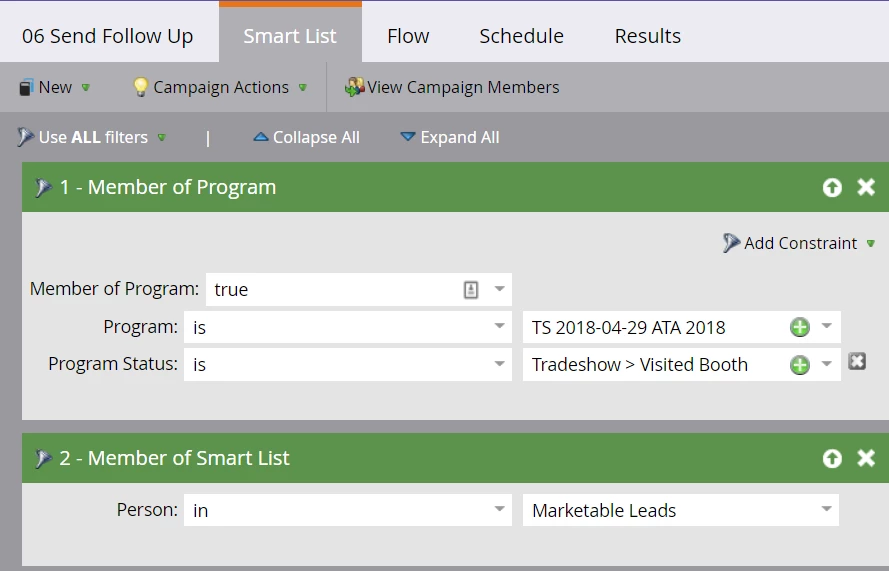 After an event, it’s a good idea to reach out to the prospects you spoke with and offer relevant content or contact information for their sales rep. Set up a new smart campaign with a smart list of two filters. The first is saying that the prospects are a member of your program who is in the status ‘visited booth.’ The second is a smart list called Marketable Leads. This is a best practice that removes people who are invalid, blacklisted, opted out, or unsubscribed. In other words, it removes people that are not valid or otherwise don’t want to be communicated with. Make sure to review the Marketable Leads smart list criteria in the Database view to ensure it’s excluding everyone it should.