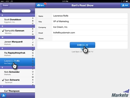Install the Marketo tablet app and log in with your Marketo credentials. Make sure your administrator has given you the mobile permissions. You will see all the events in the past seven days and the next seven days. Make sure your event program has the date properly set and select the appropriate event. You will now see all the registrants in the left navigation pane. When handing out an attendees badge at the reception, find them and click the CHECK-IN button. If you have a good internet connection, this will sync to Marketo immediately. Or you can manually click on Sync at the top as soon as you have internet access.. The Marketo program status will automatically be updated to reflect the change from Registered to Attended. You can even manually add unexpected attendees on the spot. Say goodbye to list imports and errors. You could even automatically have the slides send minutes before the event has finished.