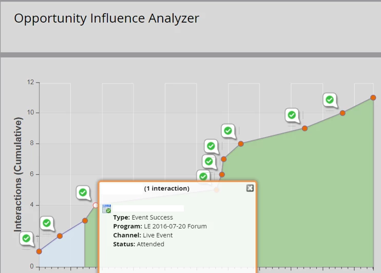 Events are often one of the best channels to find hot opportunities and by keeping your prospect’s statuses correct in event programs, you set yourself up for success. In Analytics, there is a report called Opportunity Influence Analyzer that can show the detailed steps contacts take before, during, and after an opportunity. Before and after an opportunity the report is light blue, but while the opportunity is open it is green. It makes it easy to see interactions over time and you can combine steps from multiple contacts at a company to get a more in-depth view from the account level, or you can narrow it down to just one person’s experiences.