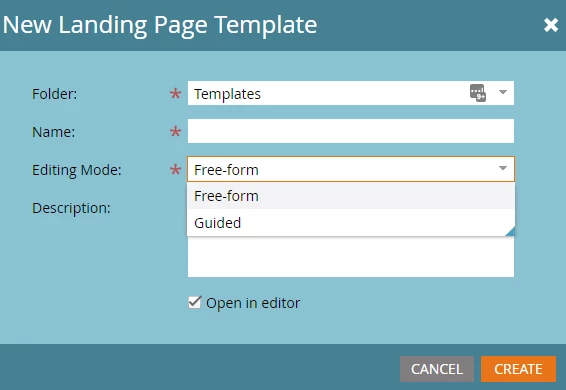 Marketo offers two types of landing page templates, Guided and Free-form. This is chosen when initially creating the template and determines the type of editing and flexibility you have with individual landing pages. This ensures developers or agencies understand the difference and pick the correct one as each has its own pros and cons.