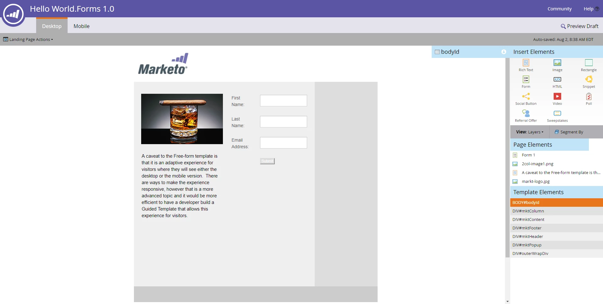 A caveat to the Free-form template is that it is an adaptive experience for visitors where they will see either the desktop or the mobile version. There are ways to make the experience responsive, however, that is a more advanced topic and it would be more efficient to have a developer build a Guided template that allows this experience for visitors.