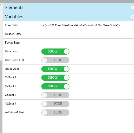 Within the syntax of the variable, your developer will assign a display name that is seen within the editor. This is where naming conventions become very important to ensure Marketo users know which variable will affect specific areas of the landing page. Boolean variables have additional options for displaying the name of each condition, here are a few examples: