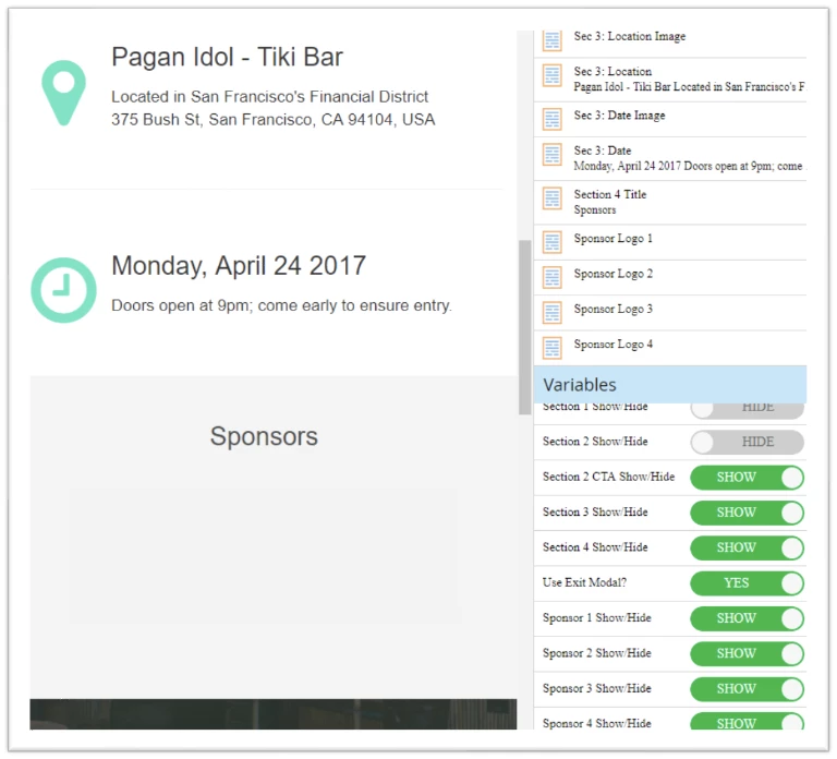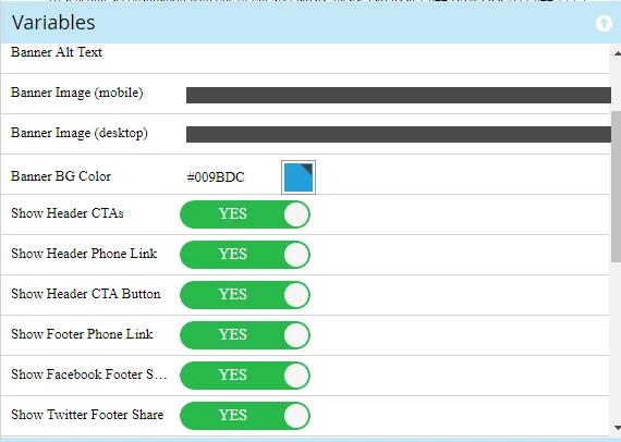 In areas that are not editable, you can utilize variables to switch out content such as a date, the color of a button, a link, or a logo. Again, this helps secure the structure and branding from being broken, while still allowing you to have the flexibility to change items from page to page.