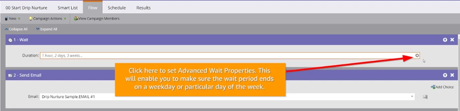 Pro-Tip: One not-so-apparent feature of Marketo's wait flow step is called advanced wait. This allows you to ensure that the wait step will not move on to the next step of the flow until a certain day of the week. For example, if you want to wait a week, but ensure you only send the next email on a weekday, this feature will extend the wait to Monday rather than delivering an email on Sunday. You can access this feature by clicking on the gear icon inside the wait flow step.