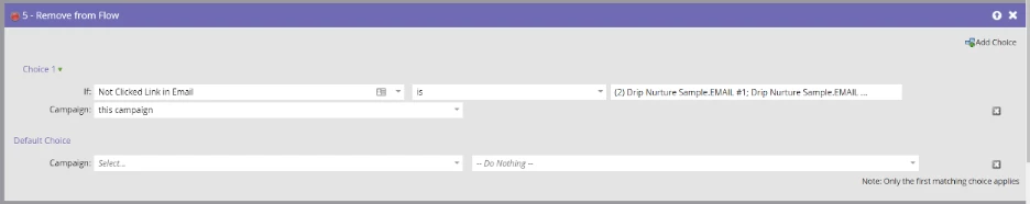 Let's talk about remove from flow first. This flow step does exactly what you think it does: it stops a lead from executing any additional flow steps. Typically, you would add a choice to this so that it only removes certain types of people; for example, maybe you have a three email drip where each email invites the lead to download a whitepaper, but they downloaded it from email #2. You can remove them from the flow so they don't get a redundant email #3. There are a million and one ways you could use this filter creatively, just remember to leave the default choice set to do nothing. Otherwise, everyone will get removed from the flow.