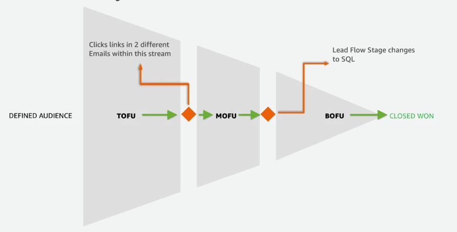 When you whiteboard the drip nurture journey for your leads, you may want to consider using a request campaign any time the journey forks based on more than one data point.