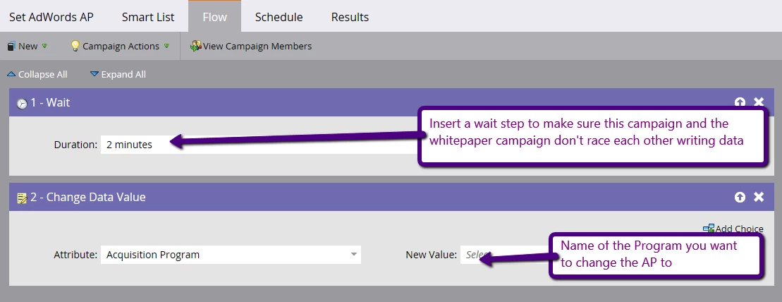 Once connected, Marketo will automatically change a person’s status in the coordinating SFDC campaign as their status changes within the Program (in other words, you don’t need to include that process as a separate flow step):