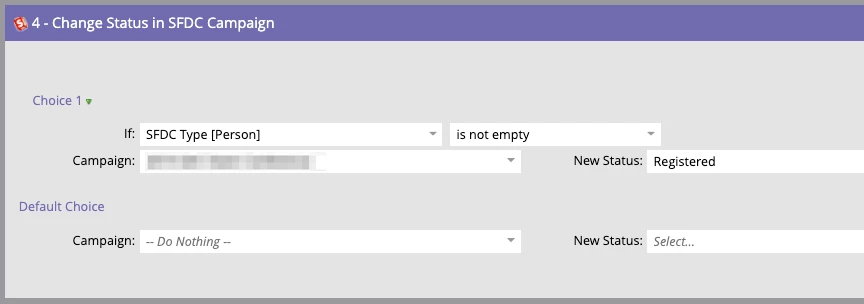 One reason why you might not want to connect a Program to your SFDC campaign is because some companies store records only in Marketo until they’re ready to sync to sales. In that case, I still recommend setting up the SFDC campaign from Marketo to ensure the statuses align, then disconnect once you’ve confirmed the sync is complete. At that point, you would have to include the status change as a separate flow step: