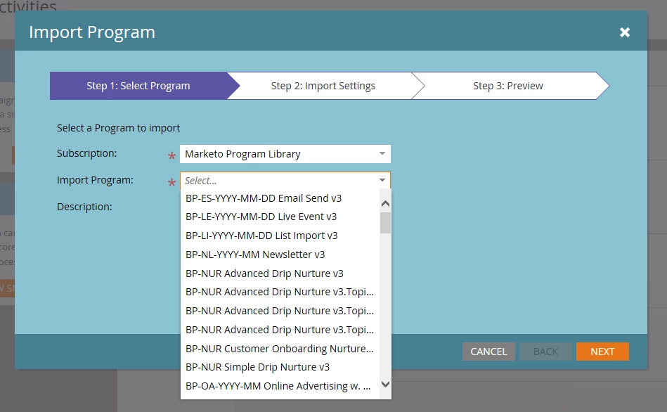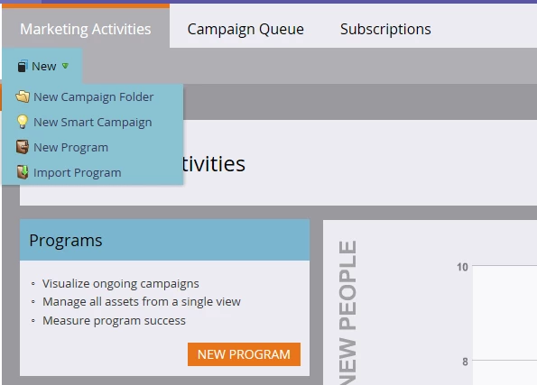 At this point, you can probably guess that you’ll have to choose an appropriate channel before creating a program. For example, a Webinar program is built using the Webinar channel. Examples of other channels might include: