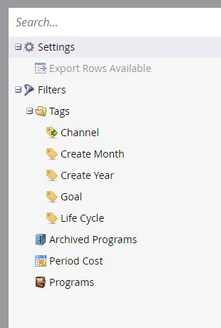 Marketo has a special Programs Performance Report. It’s very basic but it does allow for some quick program overview reports. A cool feature is that reports can be segmented/filtered easily if you have set up tags as we mentioned before.