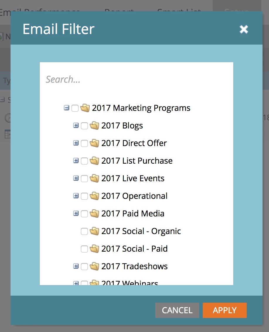 Pro Tip: If you create the email performance report locally within the program, it automatically selects the emails within the program. If you want to add emails from another program, you can manually select them from the tree in the setup tab in the report and check the emails that you want to include.