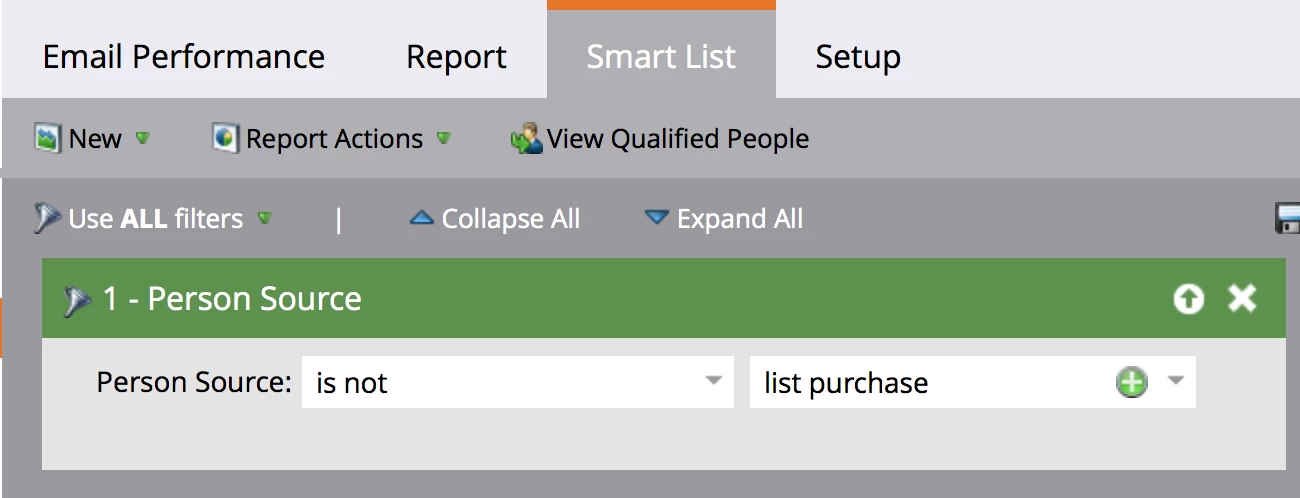 For example, my email engagement rates were very low. I hypothesized that because we purchased 50,000 cold names and that made up a significant part of my send list, those people were dragging my email engagement numbers down. I can rerun the report and exclude this population from my email performance report and see if I’m right.